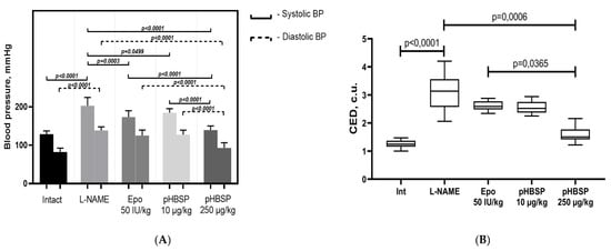 After simulation of endothelial dysfunction by the administration of N-nitro-L-arginine-methyl ether (L-NAME) in pregnant rats, systolic and diastolic blood pressure increased significantly (p < 0.0001) by 57.5 and 68.4% relative to intact animals, respectively. Administration of Epo 50 IU/kg, 11-amino acid peptide pHBSP (amino acid sequence QEQLERALNSS) at the doses of 10 µg/kg and 250 µg/kg to animals with experimental preeclampsia resulted in a decrease in systolic blood pressure by 14.6% (p = 0.0003), 9% (p = 0.0499) and 31.2% (p < 0.0001), and diastolic blood pressure by 9.5%, 7.9% and 32.8% (p < 0.0001), respectively, but the target level was not reached. (Figure 1A). Simulated ADMA (asymmetrical dimethylarginine)-like preeclampsia led to the development of endothelial dysfunction and violation of regulatory mechanisms of vascular tone, as evidenced by an increase in the coefficient of endothelial dysfunction (CED) by 148% (p < 0.0001) (Figure 1B). The administration of Epo 50 IU/kg, pHBSP for 10 days at the dosages of 10 µg/kg and 250 µg/kg in pregnant animals with ADMA-like preeclampsia led to a decrease in CED by 16.1%, 17.7%, and 48.6% (p = 0.0006), indicating improved endothelial function. When using pHBSP for 10 days kg at a dose of 250 μg/kg, the coefficient of endothelial dysfunction was statistically significantly lower than when using Epo (p = 0.0365).