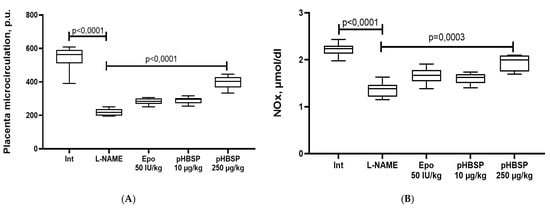 The effect of pHBSP on placental microcirculation (A) and the concentration of final stable nitric oxide metabolites (NOx) (B) in animals with ADMA-like preeclampsia (n = 10 animals in each group).