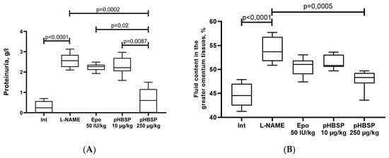 In pregnant rats with ADMA-like preeclampsia, an increased fluid content in the greater omentum tissue by 21% (p < 0.0001) was observed (Figure 3B). The administration of Epo and pHBSP from 10 to 20 days of pregnancy at the dose of 10 µg/kg does not significantly reduce the fluid content in the greater omentum tissue. In addition, in the group of animals that received pHBSP 250 µg/kg, a significant decrease in the studied fluid content in the greater omentum tissue by 11.7% (p = 0.0005) was found (Figure 3B).