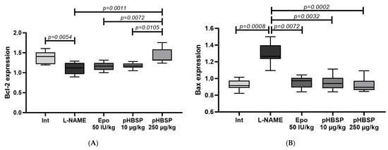 qPCR showed that the level of Bcl-2 mRNA significantly decreased in the group administered with L-NAME for seven days relative to the intact animals (p = 0.0054). Ten-day therapy with Epo and pHBSP 10 µg/kg did not restore the expression of this anti-apoptotic factor. The best result was obtained in the group of rats treated with pHBSP at the dose of 250 µg/kg. The expression of Bcl-2 in this group turned out to be statistically significantly higher than in the L-NAME group, and groups of animals that received Epo and pHBSP 10 µg/kg (Figure 4A).
