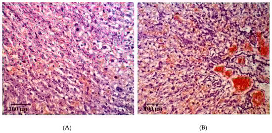 Microphotographs of the fetal placenta structures in control animals on the 21st day of gestation in simulated ADMA-like preeclampsia. Note: the area of the interstitial space is smaller compared to intact animals (A). Interstitial edema of small vessels and stroma of the villi. Local fibrin deposition. Hofbauer cells (B) are well visualized. Hematoxylin and eosin staining. Magnification: 200× (A,B).