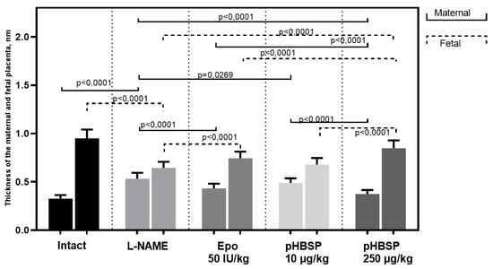 The effect of pHBSP on the thickness of the maternal and fetal placenta in animals with experimental preeclampsia (n = 10 animals in each group).