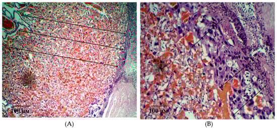 It should be noted that, in the microsections in the anchoring and terminal villi, the phenomena of angiomatosis, as well as sclerosis of their own blood vessels and the stroma of the villi were observed. The consequence of this process is a violation of histoarchitectonics and expansion of the interstitial space. In addition, in some villi, vascular thrombosis was detected, and in some villi, hemorrhages were localized both in the stroma and in the interstitial space. Deposits of fibrin filaments and elements of desquamated chorial epithelium were observed between the villi. The absence (or in a few cases) of syncytial capillary membranes and syncytial knots should be noted. This reaction is compensatory and adaptive in nature, aimed at eliminating violations and resuscitation the volume of microcirculation. It should be noted that, in the giant cell trophoblast, namely, in the visualized decidual membrane of the maternal placenta, inflammatory and dystrophic changes are pronounced. Optically empty decidual cells are determined against the background of cells with absolutely integrity structures (Figure 8A). The structure of the morphological elements is broken. Extensive focal fields of necrosis and fibrin deposits are in the field of view (Figure 8B). There is a pronounced deformation of decidual cells.