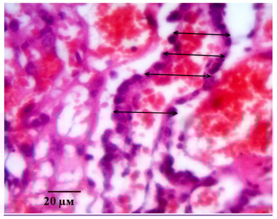 Measurement of the villi diameter (indicated by arrow) on the 21st day of gestation in animals with ADMA-like preeclampsia when pHBSP was administered at the dose of 250 µg/kg. Note: Hematoxylin and eosin staining. Magnification: 400×.