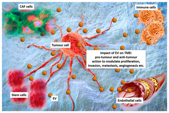 EV activate signalling pathways in cells they fuse or interact with by transferring specific genetic and non-genetic components [3,4]. EV are detected in the tumour microenvironment (TME), and emerging evidence suggests that they play a role in facilitating tumourigenesis by regulating different processes, including tumour growth, angiogenesis, immunity, and metastasis formation. Circulating EV have also been exploited as liquid biopsies and recognized as biomarkers for early detection, diagnosis, treatment and response to treatment in cancer patients [5,6,7].