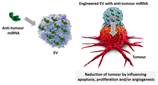 EV-miRNA-loading. Specific miRNA displaying anti-cancer properties are loaded in EV and used for treatment. Engineered miRNA-EV despatch their anti-tumour effects by regulating apoptosis, proliferation, and angiogenesis.