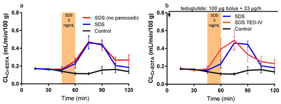 The blood-to-lumen 51Cr-EDTA clearance (CLCr-EDTA) between 0 and 120 min for the control buffer solution with or without sodium dodecyl sulfate (SDS) at 5 mg/mL added to the luminal perfusate between 45 and 60 min. (a) The effect of intravenously pretreating rats with 10 mg/kg parecoxib 30 min before the start of the SDS experiment. (b) The effect of intravenously treating rats with a 100 μg teduglutide bolus at time 0, followed by a 33 μg/h teduglutide infusion during the whole SDS experiment.