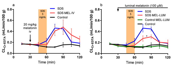 The blood-to-lumen CLCr-EDTA between 0 and 120 min for the control buffer solution with or without SDS at 5 mg/mL added to the luminal perfusate between 45 and 60 min. (a) The effect of intravenously treating rats with a 20 mg/kg melatonin bolus 30 min before the start of SDS exposure. (b) The effect of luminally treating rats with melatonin (100 μM) between 30 and 120 min in the control and SDS experiments. The * represents a significant decrease in CLCr-EDTA exposure of the luminal melatonin compared to SDS alone.