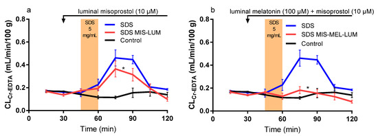Luminal misoprostol and melatonin in combination (SDS MIS-MEL-LUM) completely inhibited the SDS-induced increase in CLAUC and CLmax from the CLCr-EDTA time curves (45–120 min) (Table 1 and Figure 3b). The combination of melatonin and misoprostol also significantly decreased CLAUC and CLmax compared to administration of them separately (Table 1).