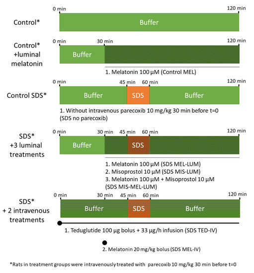 The main objective of our single-pass intestinal perfusion (SPIP) study in rats was to investigate the mucosal preventive cytoprotective effect of melatonin, misoprostol, and teduglutide, each with a different mechanism of action. Intestinal mucosal injury was induced by exposing the intestinal mucosa to the anionic surfactant, sodium dodecyl sulfate (SDS), for 15 min. This surfactant causes an acute general mucosal injury manifested by an increase in paracellular and transcellular permeability, coupled with histological changes and leakage of intracellular components [19,20]. The study drugs were administered intravenously (IV) and/or luminally before and/or during the SDS exposure. Mucosal preventive cytoprotective effects of the drugs were evaluated by monitoring intestinal passive transport of 51Cr-labeled ethylenediaminetetraacetate (51Cr-EDTA)—an inert market for mucosal barrier integrity—and evaluation of histological changes before, during, and after luminal exposure to SDS [21].