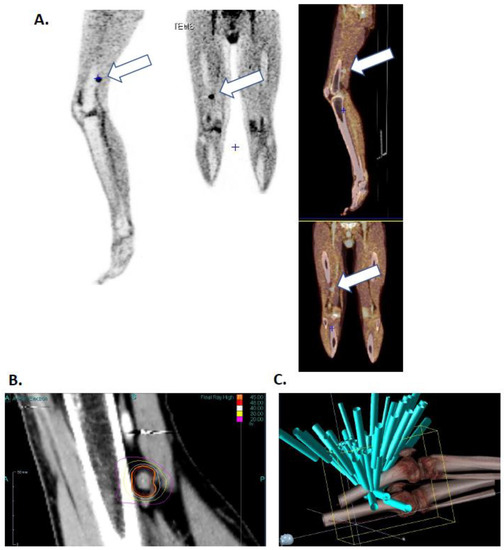 Patient’s right leg positron emission tomography (TEP) image (17/02/2016) (A), image of isodose curve around the lesion (B) and visualization of the 65 irradiation ray (C) White arrow point patients irradiated tumor.