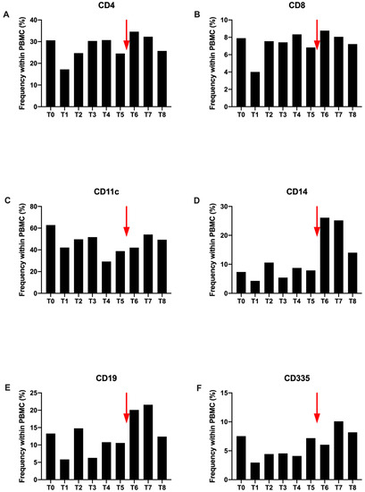 Expression of CD4+ (A), CD8+ (B), CD11c+ (C), CD14+ (D), CD19+ (E) and CD335+ (F) markers among the patient’s peripheral blood mononuclear cells. All these results were obtained from flow cytometry assay and expression percentage. The red arrow corresponds to the single injection of Nivolumab. T0 to T8 correspond to all the study time points as described above from before the radiotherapy to 1 year after the last session.