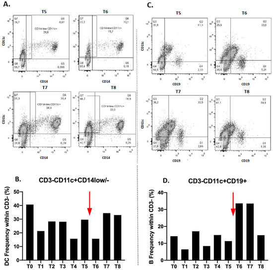 Gating strategy for frequency of CD11c+CD14low/- dendritic cells (A) and CD11c+CD19+ B lymphocytes (C) before (T5) and after (T6–8) Nivolumab injection (red arrow). Frequency of CD11c+CD14low/- dendritic cells (B) and CD11c+CD19+ B lymphocytes (D) in CD3-cells during all the follow up.