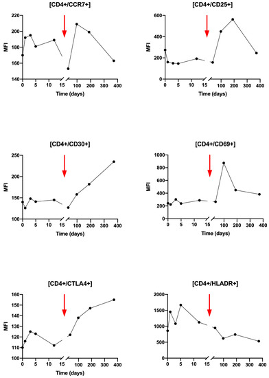 Analysis of CD4+ T lymphocytes activation state by flow cytometry for several activation markers: CCR7, CD25, CD30, CD69, CTLA4, HLADR. Results are presented over time (days) and expressed in median of fluorescence (MFI). The red arrow points the Nivolumab injection timepoint.