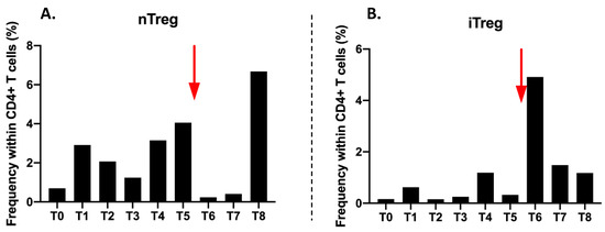 Frequency (in percentage) of CD4+CD25+/highCD127-/low nTreg (A) and frequency of CD4+CD18+CD49b+iTreg lymphocytes in CD4+ cells (B) during all timepoints of the follow up. The red arrow represent the time of the single Nivolumab injection after T5.