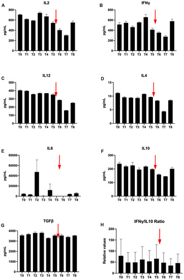 Il-12 is a cytokine predominantly secreted by activated dendritic cells. Its concentration is raised to 404 pg/mL at the beginning of the treatment and remains stable during the radiotherapy treatment. On the other hand, there is a decrease after the injection of Nivolumab until T7 (158 μg/mL) and a final slight increase at T8 (Figure 7C).