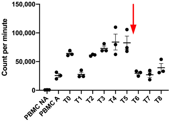 After 72 h of total incubation with exosomes, PBMC proliferation was analyzed after 18 h of incubation with [methyl-3H]-thymidine (1 μCi/well) (PerkinElmer, Waltham, MA, USA). The incorporation was evaluated using a 1450 Trilux luminometer (Perkin Elmer, Walthman, MA, USA) after the filtration of plates in a glass fiber filter (Perkin Elmer, Walthman, MA, USA) and the addition of liquid scintillation (Beckman, Brea, CA, USA). Results are the mean of triplicates and are expressed in count per minute (CPM).