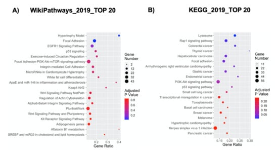 The deregulated transcripts with a deregulation ≥1 in terms of |Log2FC| were subjected to pathways analysis via the Enrichr web tool [43]. We identified the top 20 deregulated pathways with the WikiPathways 2019 and KEGG 2019 tools (Figure 2). Thanks to these analyses, we were able to highlight the pathways mainly altered when NPCs were grown inside the Nichoid. The 3D scaffold implicates changes in the cellular morphology and signaling, which could finally result in an overall deregulation of gene expression. The WikiPathways and KEGG analysis support this, as in the WikiPathways 2019, amongst the top 20 deregulated pathways (Figure 2A), we found five pathways implicated in alteration in the membrane and cytoskeleton conformation, supporting the morphological changes observed with in vivo microscopy, such as the close interactions with the scaffold. These pathways are: the focal adhesion pathway, the focal adhesion-PI3K-Akt-mTOR signaling pathway, the integrin-mediated cell adhesion pathway, the regulation of the actin cytoskeleton, and the alpha 6-beta 4 integrin signaling pathway. Other signaling pathways result strongly implicated, and these are the EGFR1 signaling pathway and the kit receptor signaling pathway. Changes in gene expression obtained simply after the cells are placed in the scaffold implicate pathways correlated with the cellular metabolism (e.g., white fat cell differentiation, keap1-nrf2, adipogenesis genes, aflatoxin b1 metabolism, SREBF and miR-33 in cholesterol, and lipid homeostasis) and proliferation (p53 signaling, hypertrophy model, miRNA in cardiomyocyte hypertrophy, Wnt signaling pathway netPath, pluriNetWork, Wnt signaling pathway, and pluripotency). A full list of the 149 deregulated WikiPathways 2019 is reported in Table S2. These findings are supported by KEGG 2019 analysis, which also presents pathways implicated in cellular morphology (e.g., focal adhesion), signaling pathways (e.g., Rap1 signaling pathway and PI3K-Akt signaling pathway) and proliferation (e.g., p53 pathway) (Figure 2B). The full list of the 277 significantly deregulated KEGG pathways is reported in Table S3.