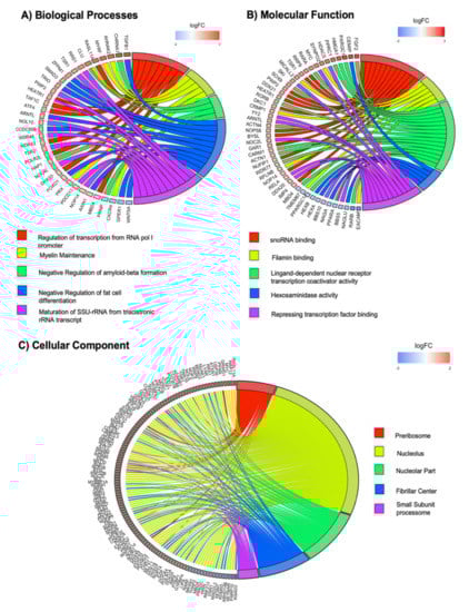 GO analysis for DE genes in NPCs expanded in the Nichoid compared to NPCs grown in standard conditions. (A) Top five enriched GO terms for Biological Process, (B) Molecular Function, and (C) Cellular Component are shown. The panels have been obtained considering all DE genes, and the color represents different pathways implicated to the deregulated genes.