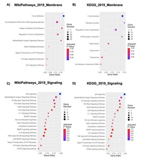 Deregulated pathways and genes correlated with membrane and signal transduction processes. WikiPathways analysis (A) and KEGG analysis (B) highlighted nine and eight deregulated pathways, respectively, for membrane processes. WikiPathways analysis (C) and KEGG analysis (D) highlighted 18 and 29 deregulated pathways, respectively, for signal transduction. The y-axis represents the name of the pathway, the x-axis represents the Rich factor, dot size represents the number of different genes, and the color indicates the adjusted p-value.