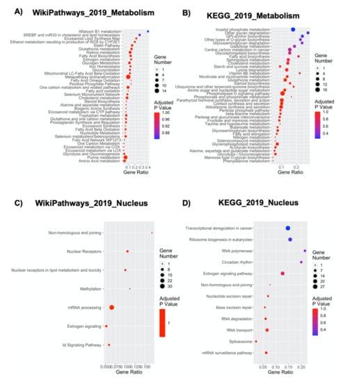 Deregulated pathways and genes correlated with metabolic alterations and nuclear response. WikiPathways analysis (A) and KEGG analysis (B) highlighted 38 and 68 deregulated pathways, respectively, for metabolic alterations. In panel (B) are shown the top 40 deregulated pathways. WikiPathways analysis (C) and KEGG analysis (D) highlighted 6 and 10 deregulated pathways, respectively, for nuclear response. The y-axis represents the name of the pathway, the x-axis represents the Rich factor, dot size represents the number of different genes, and the color indicates the adjusted p-value.