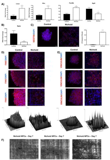 Evidences of adhesion complexes and cytoskeletal deregulation. (A) Differential expression of genes involved in adhesion complexes was verified by real-time PCR in a larger cohort (four experiments each performed in duplicates, N = 8) of NPCs grown in standard floating conditions and NPCs grown inside the Nichoid for Cntn2, Il6ra, Pard6b, and Itga6. GAPDH was used as housekeeping gene. Data are expressed as mean of four independent experiments, each performed in duplicate ± SEM (n = 8), * p < 0.05, ** p < 0.01 vs. control. (B) Differential expression of genes involved in cytoskeletal remodeling was verified by real-time PCR in a larger cohort (four experiments each performed in duplicates, N = 8) of NPCs grown in standard floating conditions and NPCs grown inside the Nichoid for Rarb. GAPDH was used as housekeeping gene. Data are expressed as mean of four independent experiments, each performed in duplicate ± SEM (n = 8), ** p < 0.01, vs. control. (C) Immunofluorescence images of Nestin, in red, and nuclei, in blue (DAPI), of standard floating NPCs or inside the Nichoid. Scale bar: 20 μm. Images are representative of two fields acquired per Nichoid (N = 2). The histogram refers to the number of prolongments counted in the image over the total nuclei number (N = 2, **** p < 0.0001 vs. control). (D) Immunofluorescence images of focal adhesion kinase (FAK), in red, and nuclei, in blue (DAPI), of standard floating NPCs or inside the Nichoid. Scale bar: 20 μm for the two top images and 10 μm for the bottom images. Images are representative of three fields acquired per Nichoid (N = 3). The surface plot was obtained using the Image J software, and it represents the distribution of the marker on the analyzed surface. (E) Immunofluorescence images of Vinculin, in red, and nuclei, in blue (DAPI), of standard floating NPCs or inside the Nichoid. Scale bar: 20 μm for the two top images and 10 μm for the bottom images. Images are representative of three fields acquired per Nichoid (N = 3). The surface plot was obtained using the Image J software, and it represents the distribution of the marker on the analyzed surface. (F) Images of NPCs grown for 7 days inside the Nichoid and then fixed and analyzed by environmental scanning electron microscope (ESEM) at 2000× magnification. Images are representative of six fields acquired per Nichoid, in 2 different Nichoids (n = 12). Scale bar: 10 µm for the left image and 10 μm for the right images.