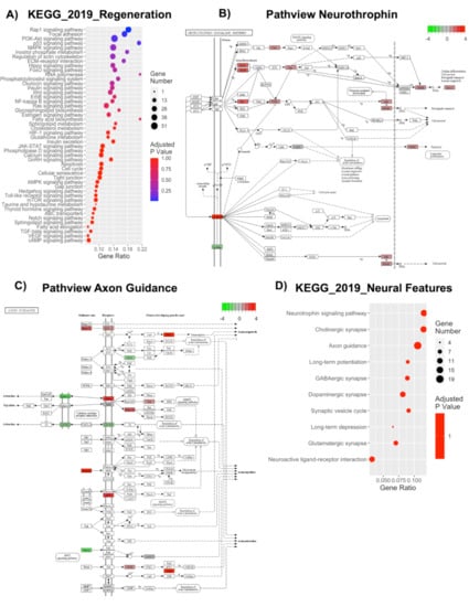 Deregulated pathways and genes correlated with regeneration and neural features. (A) KEGG analysis highlighted 48 deregulated pathways for regenerative processes. (B,C) Pathview of neurotrophins signaling pathway and axon guidance, respectively. In red, upregulated genes are shown, whereas in green, downregulated ones are shown. (D) KEGG analysis of neural features highlighted 10 deregulated pathways. The y-axis represents the name of the pathway, the x-axis represents the Rich factor, dot size represents the number of different genes, and the color indicates the adjusted p-value.