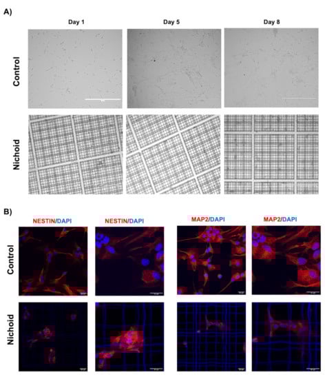 Differentiated neural precursors cells grown inside the Nichoid. (A) In vivo direct light images (EVOS FL microscope, EuroClone) of control NPCs (control) or differentiated inside the Nichoid (Nichoid) stimulated with differentiation medium at day 1, 5, and 8. Scale bar: 400 μm. Images are representative of what was observed in two independent experiments (B) Immunofluorescence images of NESTIN and MAP2, in red, and nuclei, in blue (DAPI), of differentiated NPCs in control flat conditions or inside the Nichoid. Scale bar: 20 μm. Images are representative of three fields acquired per Nichoid (n = 3).