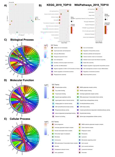 Computational analysis of neural precursor Cells detached from the Nichoid and brought back to standard floating conditions for 7 days. RNA-Seq was performed on three samples for condition (n = 3). Specifically, three experiments were performed each including one sample of NPCs grown in standard floating conditions for 7 days and one sample of NPCs grown inside the Nichoid and replated in standard floating condition for 7 more days. (A) Principal component analysis (PCA) of differently expressed genes in NPCs replated after Nichoid-growth and in standard conditions. We considered as differentially expressed only genes showing |log2(Nichoid samples/control samples)| ≥ 1 and a false discovery rate of ≤0.1. (B) Pathway analysis for DE genes in NPCs replated after Nichoid-growth to NPCs grown in standard conditions. The y-axis represents the name of the pathway, the x-axis represents the gene ratio, dot size represents the number of different genes, and the color indicates the adjusted p-value. Dot plot of top 10 deregulated pathways from KEGG and WikiPathways analysis. (C–E) GO analysis for DE genes in NPCs replated after Nichoid-growth compared to NPCs grown in standard conditions. (C) Top 20 enriched GO terms for Biological Process, (D) Molecular Function, and (E) Cellular Component are shown. The panels have been obtained considering all DE genes, and the color represents different pathways implicated to the deregulated genes.