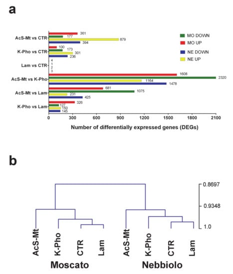 Transcriptome analysis of leaf samples obtained from ‘Nebbiolo’ and ‘Moscato’ plants artificially inoculated with Erysiphe necator and then untreated (CTR) or treated with acibenzolar-S-methyl (AcS-Mt), potassium phosphonate (K-Pho), and laminarin (Lam). In (a), the total number of differentially expressed genes (DEGs), up (UP) or down (DOWN)-regulated, is shown for each RNAseq comparison beside the bar charts. MO = ‘Moscato’; NE = ‘Nebbiolo’. In (b), the dendrogram displays the output of the HCL (Hierarchical Clustering) analysis performed on RNAseq data. The numbers reported next to each node are bootstrap values from 1000 replicates.