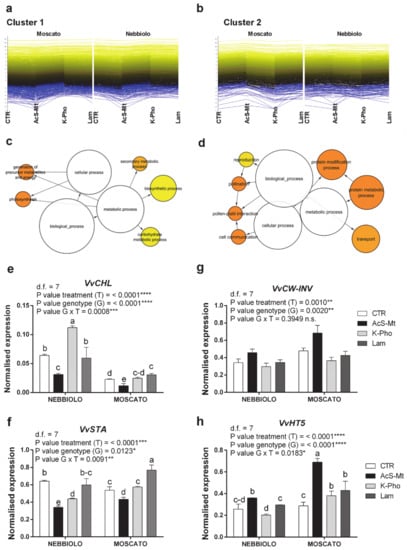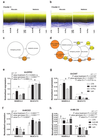 Treatment effect on transcriptional reprogramming of defense responses. (a,b) Output of HCL (Hierarchical Clustering) analysis conducted on RNAseq data. Clusters of differentially expressed genes (DEGs) showing a down-regulation (a, cluster 1) or up-regulation (b, cluster 2) transcriptional pattern in association with acibenzolar-S-methyl application (AcS-Mt) in ‘Moscato’ and ‘Nebbiolo’ leaf transcriptomes. (c,d) Significant enriched GO biological functional categories identified for each group of genes belonging to (c) cluster 1 and (d) cluster 2 using Cytoscape with the BINGO plug-in and listed according to their enrichment p-value (p < 0.05). (e–h) Results of candidate gene expression analysis performed by RT-qPCR assay. Expression profiles of key genes belonging to cluster 1 (e-VvCHL, VIT_07s0151g00110; f-VvSTA, VIT_02s0025g02790) and cluster 2 (g-VvCW-INV, VIT_09s0002g02320; h-VvHT5, VIT_05s0020g03140) analyzed in leaf samples taken from ‘Nebbiolo’ and ‘Moscato’ plants artificially inoculated with Erysiphe necator and then untreated (CTR) or treated with acibenzolar-S-methyl (AcS-Mt), potassium phosphonate (K-Pho), and laminarin (Lam). Ubiquitin (VvUBI) and Actin (VvACT1) genes were both used as endogenous controls for the normalization of transcript levels. Significance of genotype, treatment, and genotype × treatment (G × T) interaction was assessed by Tukey’s HSD test for p ≤ 0.05 (*), p ≤ 0.01 (**), p ≤ 0.001 (***), and p ≤ 0.0001 (****) and the corresponding results are given above each graph in the figure panel; n.s. = not significant. Lower case letters above bars are reported when the G × T interaction and/or genotype (G) main effects are statistically significant as attested by Tukey’s HSD or Student’s t-test, respectively. Error bars represent SE. Three independent biological replicates with three technical replicates each were used for the analysis.