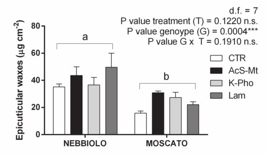 Differences in epicuticular wax deposition. Content of epicuticular waxes (µg cm−2) present on leaves of ‘Nebbiolo’ and ‘Moscato’ plants artificially inoculated with Erysiphe necator and then untreated (CTR) or treated with acibenzolar-S-methyl (AcS-Mt), potassium phosphonate (K-Pho), and laminarin (Lam). Significance of genotype, treatment, and genotype × treatment (G × T) interaction was assessed by Tukey’s HSD test for all p values and the corresponding results are given above each graph in the figure panel; *** indicates p ≤ 0.001 and n.s. = not significant. Lower case letters above bars denote the significance of the Genotype (G) main effects as attested by the Student’s t-test. Error bars represent SE (n = 3).