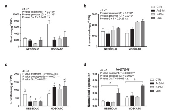Statistically significant differences among treatments, genotypes, or interactions were determined by performing a two-way analysis of variance (ANOVA) test. When an ANOVA test indicated that either genotype (G: ‘Nebbiolo’, ‘Moscato’) or treatment (T: CTR, AcS-Mt, K-Pho, Lam) or their interaction (G × T) was significant, the Tukey’s honestly significant difference (HSD) post-hoc test was used to separate means (p < 0.05) using the SPSS statistical software package (v23.0; SPSS Inc., Cary, NC, USA). Genotype (G) main effects were statistically determined by the Student’s t-test. The GraphPad Prism software (GraphPad Software, La Jolla, CA, USA v.6.01) was used to elaborate figure charts.