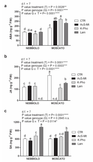 Effects due to the considered variables were particularly evident when concentrations of ABA, JA, and SA were analyzed in the two cultivars (Figure 6). For instance, genotype was the component that mostly affected ABA contents, which were significantly higher in ‘Moscato’ than in ‘Nebbiolo’, even in absence of treatment (Figure 6a). These data supported at the metabolic level the strong activation of the ABA biosynthetic gene NCED in ‘Moscato’ leaves (Figure 3). While in ‘Moscato’ ABA concentrations were positively affected by all applied treatments, and particularly by AcS-Mt and K-Pho, in ‘Nebbiolo’ the same resistance elicitors did not affect or even reduce, endogenous ABA levels with respect to CTR condition (Figure 6a), thus highlighting the influence of the G × T interaction. Samples collected from CTR plants of ‘Moscato’ were also particularly enriched in JA, with values more than two-fold higher than in ‘Nebbiolo’ CTR leaves (Figure 6b). All treatments did significantly reduce JA concentrations in ‘Moscato’, while in ‘Nebbiolo’ a similar result was only observed in the case of Lam application. Moreover, with the exception of K-Pho, the resistance inducers had the opposite effect on the JA levels of the two cultivars: JA was not detectable in AcS-Mt-treated leaves of ‘Moscato’, the same happened to ‘Nebbiolo’ but under Lam application (Figure 6b), underlining the strong effect due to the G × T interplay. Finally, a strong accumulation of SA was noticed in Lam-treated samples of both cultivars (Figure 6c).
