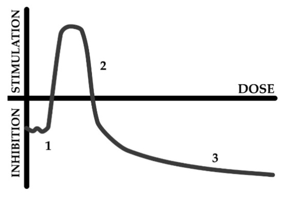 Scheme of hormesis dose–response model. The response includes stages of stress recognition (1), stimulation (activation) (2), and inhibition (3).