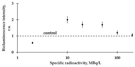In the current study, we chose tritium as a source of beta radiation. The choice was justified by an environmental prevalence of tritium; it is one of the most common decay products in the nuclear industry. Cases of activation and inhibition of bacterial bioluminescence by tritium were under consideration in [15,22,28,29,30,31]. The effects of tritium on bacterial enzymes were studied as well [30]. The application of bacterial enzymes as bioluminescence assay systems was developed earlier [37,38,39,40,41].