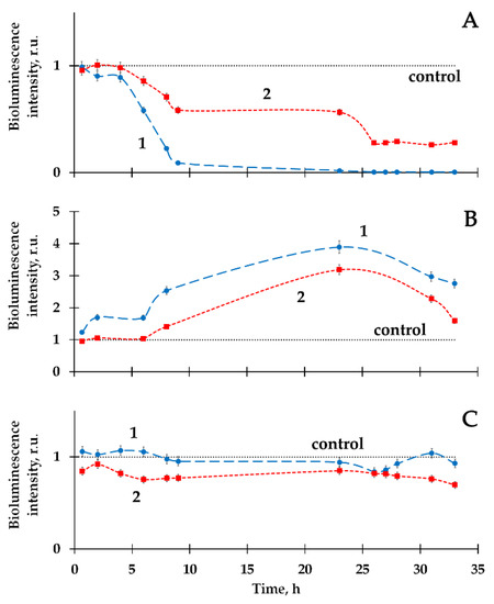 Curves 1 and 2 compare the effects of HTO in the absence and presence of HS. It is seen that HS move the kinetic curves closer to the control for bioluminescence inhibition (Figure 3A) and activation (Figure 3B), mitigating the HTO impact. Figure 3C demonstrates that HS change the bioluminescence kinetics negligibly in the case of the absence of an initial HTO impact.