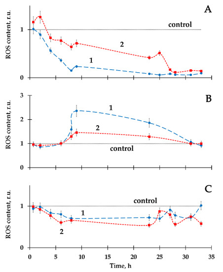 The decrease (Figure 4A, curve 1) and increase (Figure 4B, curve 1) in ROS content were observed in the radioactive bacterial suspensions, as compared to the control (non-radioactive) samples.
