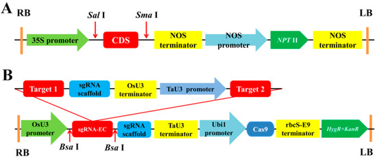 Primers with restriction enzyme cutting sites were designed using the Primer 5 software according to the sequences of the target genes and overexpression vectors. The sgRNA was designed according to the PAM/NGG domain on the sequences of the target genes. The sgRNA requires the content of GC% to be higher than 40%, absence of four consecutive thymines, and continuous pairing between sgRNA and target gene less than 8 bp. The primers for overexpression and knockout vector construction are listed in Table S1.