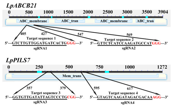 Selection of sgRNA for LpABCB21 and LpPILS7 gene editing. The conserved domains and their locations are labeled. The cyan lines correspond to compositionally biased regions and were not used for domain database search. The red letters correspond to the NGG domains.