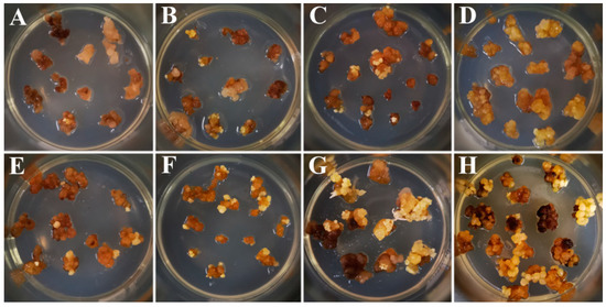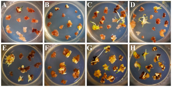 After two rounds of antibiotic screening, the transformed calli were cultured in somatic embryo induction medium for 30 days. The growth of resistant calli is shown in Figure 3. The results indicate that a higher number of resistant calli masses were generated by the RC5.0 treatment (Re-suspension II and Co-cultivation II) (E–H) than that was generated by the RC5.8 (Re-suspension I and Co-cultivation I) (A–D), and all resistant calli masses had a larger volume and a higher number of clusters.