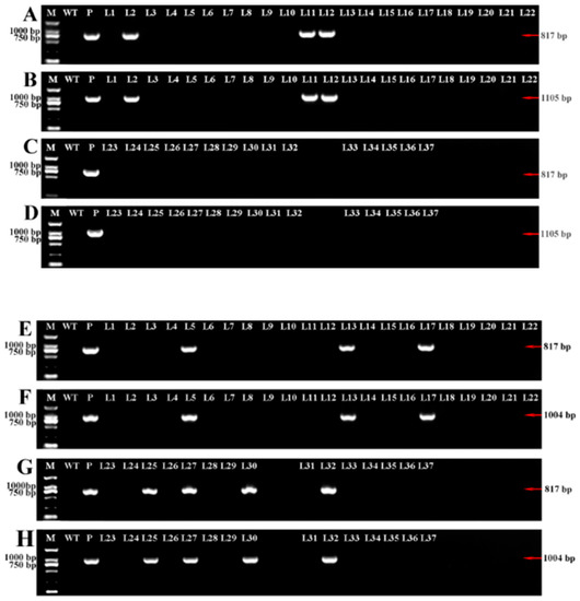 PCR (polymerase chain reaction) identification of OE-LpABCB21 (A–D) and OE-LpPILS7 (E–H) positive lines. (A,C,E) and (G) are the cloning results of NPTII gene (817 bp); (B) and (D) are the cloning results obtained using the primers against the 35S promoter and LpABCB21 (1105 bp); (F) and (H) are the cloning results obtained using the primers against the 35S promoter and LpPILS7 (1004 bp). L33–L37 in (C,D) and L31-L37 in (G,H) are obtained before the improvement. The other lines are obtained after the improvement. M, 2 kb DNA marker. WT, wild-type plant. P, vector plasmid control.