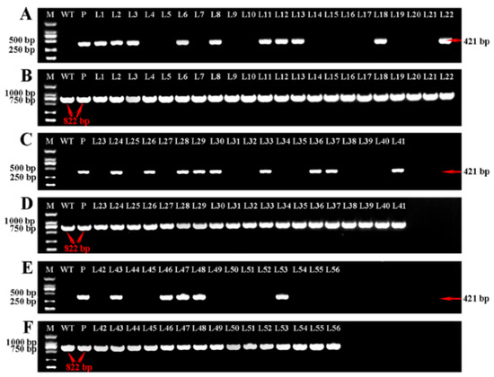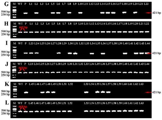 PCR identification of KO-LpABCB21 (A–F) and KO-LpPILS7 (G–L) positive plants. (A,C,E,G,I) and (K) are the cloning results obtained using the primers against the OsU3 promoter and sgRNA expression cassette (421 bp). (B,D) and (F) are the cloning results of the fragments on LpABCB21 containing dual sgRNA (822 bp). (H,J) and (L) are the cloning results of the fragments on LpPILS7 containing dual sgRNA (469 bp). L42–L56 in (E,F) and L53–L63 in (K,L) are obtained before the improvement. The other lines are obtained after the improvement. M, 2 kb DNA marker. WT, wild-type plant. P, vector plasmid control.