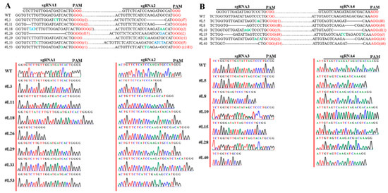To identify the mutation modes of the mutant lines, the cloned PCR fragments from KO-LpABCB21 and KO-LpPILS7 positive plants were purified and sequenced; the mutation modes are shown in Figure 7. Mutations occurred in 7 of the 24 KO-LpABCB21 positive plants, and no mutations occurred in line L29 at the sgRNA1 site. Mutations occurred in six of the 28 KO-LpPILS7 positive plants, and heterozygous mutations occurred in lines L10 and L28 at the sgRNA3 site.