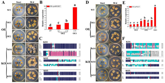 The effects of overexpression and knockout of LpABCB21 and LpPILS7 on somatic embryo induction in L. pumilum. (A), somatic embryo was induced by LpABCB21 transgenic lines; (B), the expression levels of LpABCB21 in overexpression lines; (C), the protein sequence alignment of KO-LpABCB21 mutant lines; (D), somatic embryo was induced by LpPILS7 transgenic lines; (E), the expression levels of LpPILS7 in overexpression lines; (F), the protein sequence alignment of KO-LpPILS7 mutant lines. WT, wild-type plants; OE, overexpression lines; OE1, the expression level increases by more than 9-fold; OE2, the expression levels increases by 2–4-fold; OE3, the expression level did not change significantly; KO, mutant lines; KO1, frame shift mutations; KO2, mutation between dual sgRNA; KO3, mutations in dual sgRNA. Start, the emergence time of somatic embryo is marked in the image; 50 d, somatic embryo induction for 50 days. Data were analyzed using one-way ANOVA using SPSS; the differences were compared using Fisher’s least significant difference test (LSD) at the 5% significance level. The red vertical bars in C and F represent the edge of dual sgRNA.