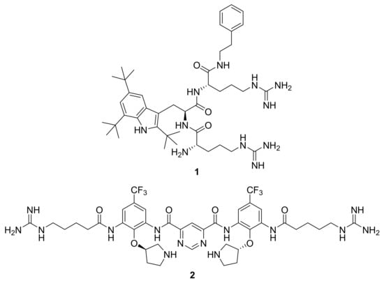 The limitations of AMPs have stimulated the development of AMP mimics such as α-peptides [], β-peptides [,] and peptoids [,]. In addition, there have been reports of several small molecular AMP mimics such as anthranilamides [], cationic peptoids [], cholic acid derivatives [] and phenyleneethynylenes []. Similar to natural AMPs, these AMP mimics possess an amphiphilic structure with good spatial separation between the hydrophobic and cationic groups. Among these AMP mimics, Lytixar (LTX-109) 1 and Brilacidin (PMX-30063) 2 (Figure 1) have completed phase II human clinical trials, suggesting that AMP mimics could be potential therapeutic agents for treating bacterial infections [].