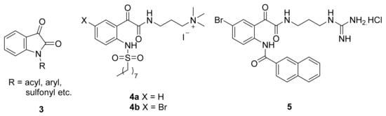 Isatin (indoline-2,3-dione) is a natural product found in plants of the genus Isatis []. Its derivatives have been reported to show a wide range of biological and pharmacological properties, such as being antimicrobial, anti-inflammatory, anticancer, antiviral and acting as analgesics []. Interestingly, N-acyl, N-aryl and N-sulfonylisatins 3 (Figure 2) can act as electrophiles and be ring-opened by amines and alcohols to afford the corresponding phenylglyoxamides and glyoxylic esters, respectively [,]. Since ring-opened phenylglyoxamide derivatives possess an amide bond, they are potential candidates for the development of AMP mimics. Our group has previously reported the synthesis of phenylglyoxamides (e.g., 4–5) derived from N-acylisatins and N-sulfonylisatins [,,]. Among these molecules, N-sulfonylphenylglyoxamide iodide salt 4b and N-naphthoylphenylglyoxamide guanidinium salt 5 had moderate to good minimum inhibitory concentrations (MIC) of 63 and 12 μM respectively, against Gram-positive S. aureus [,]. However, these compounds gave no antibacterial activity against Gram-negative bacteria. Hence, we were interested to structurally modify these compounds as part of the optimisation process.