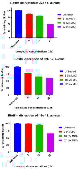 The remaining three tested antimicrobial peptide mimics (15d, 22a, 22c) failed to disrupt any performed S. aureus biofilms at any tested concentrations (Supplementary Figure S1), suggesting that they are active against planktonic S. aureus cells but are unable to disrupt bacteria that are densely packed in matrices of extracellular polymeric communities.