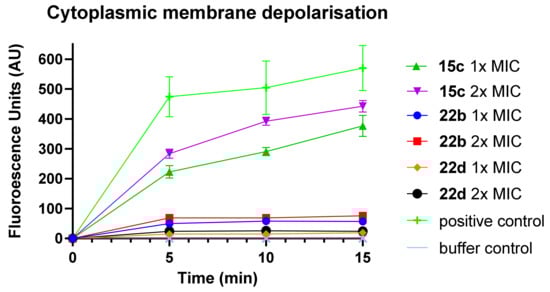 Cytoplasmic membrane disruption of S. aureus promoted by compounds 15c, 22b and 22d at 1× and 2× of their MIC. 10% DMSO was used as positive control.