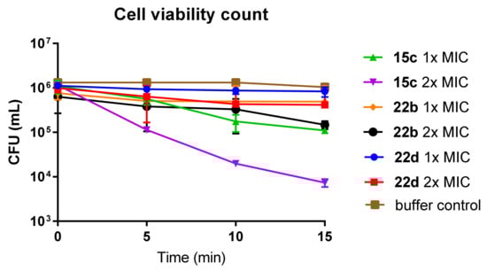 Cell viability count of S. aureus in the presence of compound 15c, 22b and 22d at 1× and 2× their MIC.